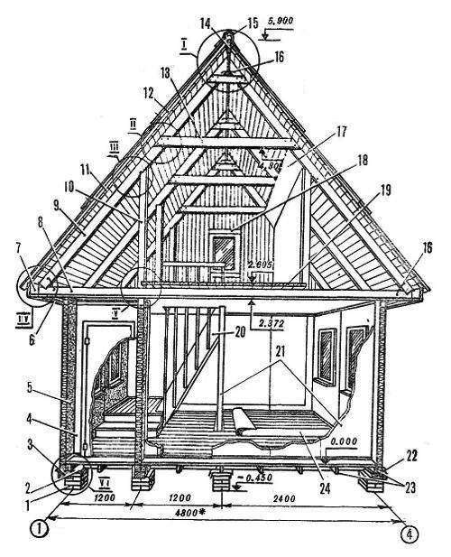Данный вариант предусматривает использование столбчатого фундамента, поверх которого укладывают брус обвязки, предварительно поместив под него гидроизоляцию в два слоя рубероида, чтобы защитить помещения и саму конструкцию от проникновения почвенной влаги. Брус обвязки повторяет рисунок плана. В углах и местах примыкания балок соединения выполняют в четверть и скрепляют гвоздями. По внешнему краю обвязки устанавливают щиты, образующие стены. Для этого понадобится три типа щитов: глухие, с типовым оконным блоком ОР12-09 и с типовым дверным блоком ДГ21-9. Все щиты собирают из бруса 100х100 мм, образующего каркас 2500х1196 мм, который обшивается листами древесноволокнистых плит фанерой, досками. Наружные стены заполняют утеплителем из минеральной ваты. Внутренние перегородки могут быть пустотелыми. Щиты крепятся к брусу обвязки гвоздями косым забоем. Поверху стены стягивают доской 19х110 мм, образующей верхнюю обвязку. По завершении монтажа вертикальных конструкций в помещениях первого этажа устраивают пол. На выступы нижней обвязки раскладывают лаги брусья сечением 50х100 мм в направлении осей, обозначенных цифрами, на расстоянии 600 мм друг от друга. |